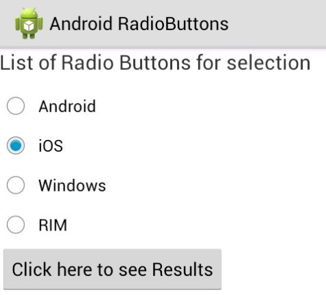 Tombol Radio digunakan saat kita ingin memilih hanya satu item dari daftar item. android:orientation :Bisa horizontal atau vertikal setOnCheckedChangeListener() :Ini mencatat panggilan balik untuk dipanggil saat tombol radio yang dicentang berubah dalam grup ini. dan berikut contoh sintaks yang diterapkan pada layout (xml). Sumber : Master Android (App)