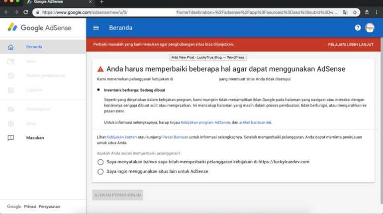 Hi, Kali ini gw mau bahas cara memperbaiki masalah “Konten Sedang Dibuat / Navigasi pada saat daftar AdSense. Penyebab pada kasus ini penyebabnya adalah konten kalian ada beberapa yang kosong, misalnya kalian membuat kategori dan dalam kategori belom diisi berati itu tandanya konten kalian kosong, tidak ada Privacy Policy, Disclaimer, Terms of Service, Contact Us […]